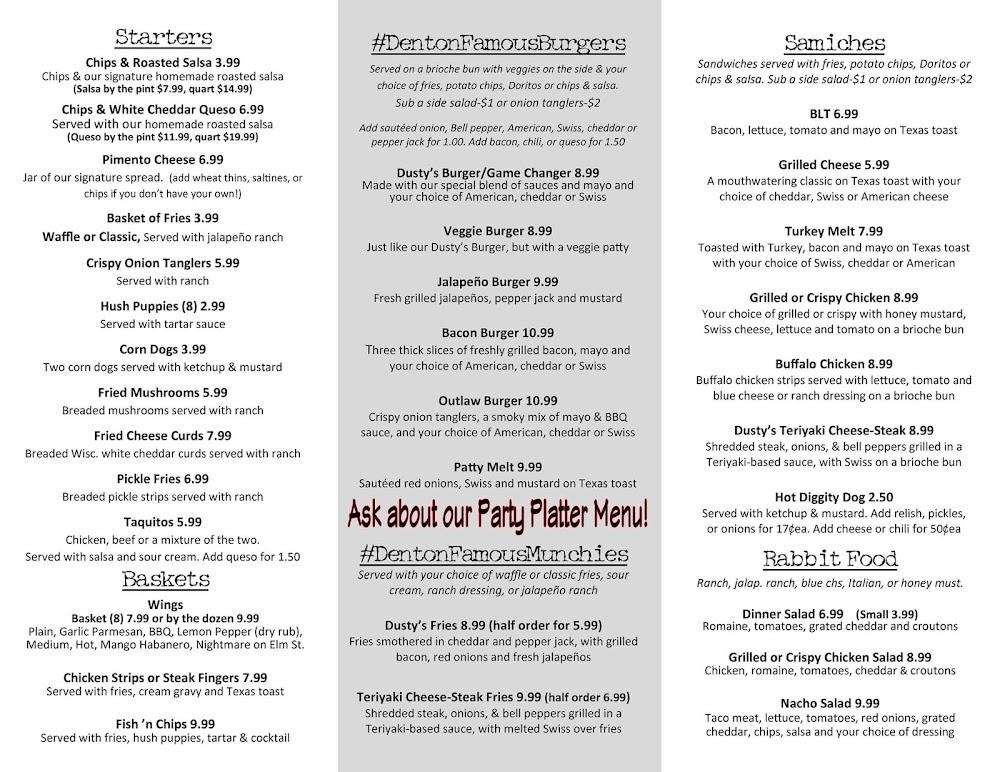 Welcome to Dusty's Bar & Grill, your go-to spot in Denton since 2002! Open daily at 11am, we offer a diverse menu filled with delicious options, from hearty sandwiches and fresh salads to our renowned Dusty's Burger and mouthwatering fries. Whether you’re stopping in for lunch or planning a late-night hangout, our kitchen stays open until 2am, ensuring you’re never hungry. Join us for a variety of nightly events and enjoy our vibrant atmosphere, featuring excellent cocktails, a great selection of beers, and plenty of entertainment options. Come experience the eclectic spirit of Denton with us at 119 S Elm St!